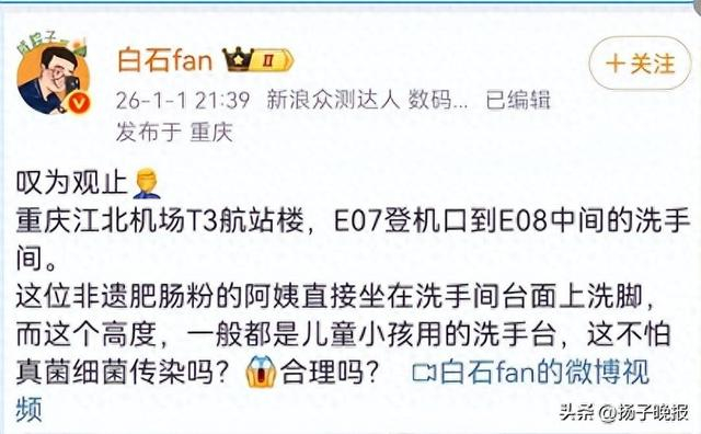 1月1日,科技数码博主“白石fan”在微博发视频称,在重庆江北机场T3航站楼,发现有工作人员竟然用儿童洗手盆洗脚。