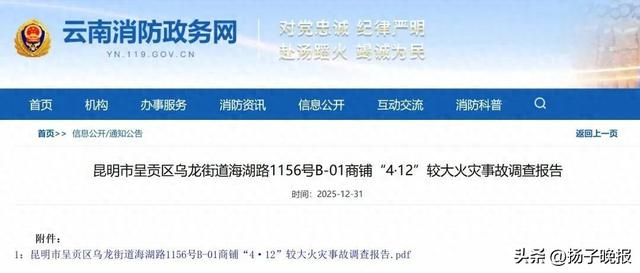 调查认定:昆明市呈贡区乌龙街道海湖路1156号B-01商铺“4·12”火灾是一起因电动自行车入户充电,涉事商铺违规住人,违规使用和改装超标电动自行车,违规改装蓄电池,蓄电池短路起火,有关部门、单位职责落实不到位导致的非生产经营性的较大火灾事故。