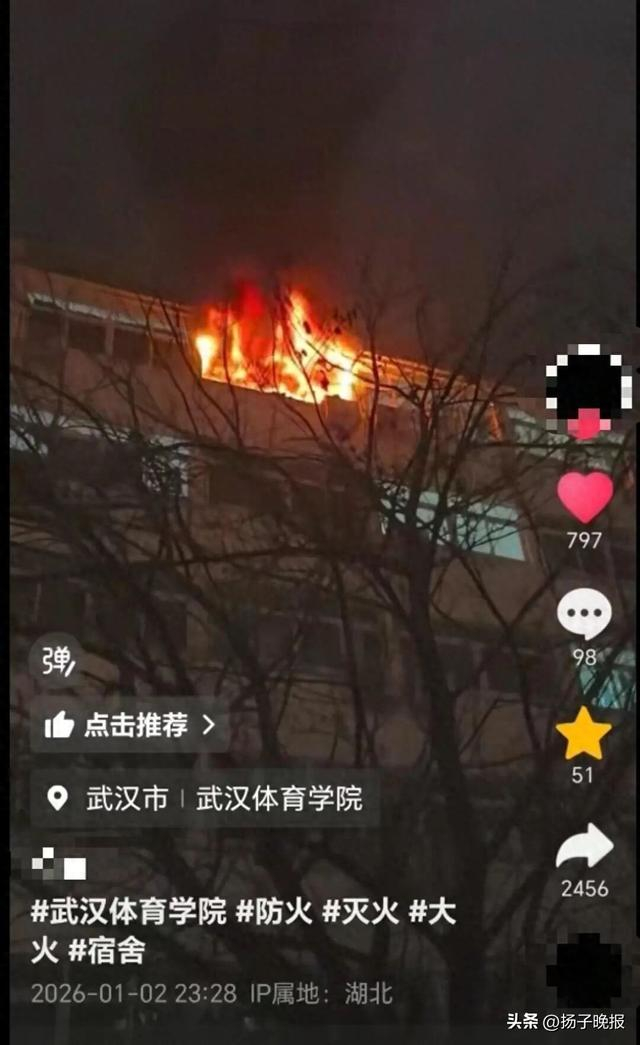 1月2日深夜,武汉体育学院一栋宿舍楼发生火灾。