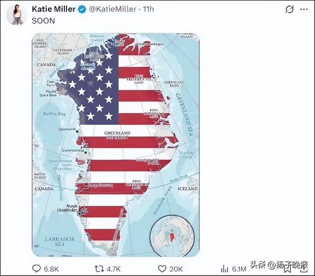 据美国有线电视新闻网(CNN)此前报道,凯蒂·米勒是美国保守派网红,是美国总统特朗普的重要支持者,她的丈夫是美国总统助理、政策副幕僚长和国土安全顾问斯蒂芬·米勒。由于特朗普曾于2025年1月声称美国不排除动用武力控制格陵兰岛,结合凯蒂·米勒的身份,许多网民认为这则帖子是在暗示美国“将拿下格陵兰岛”。