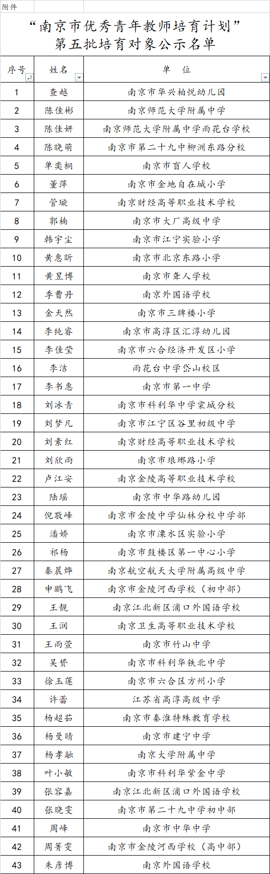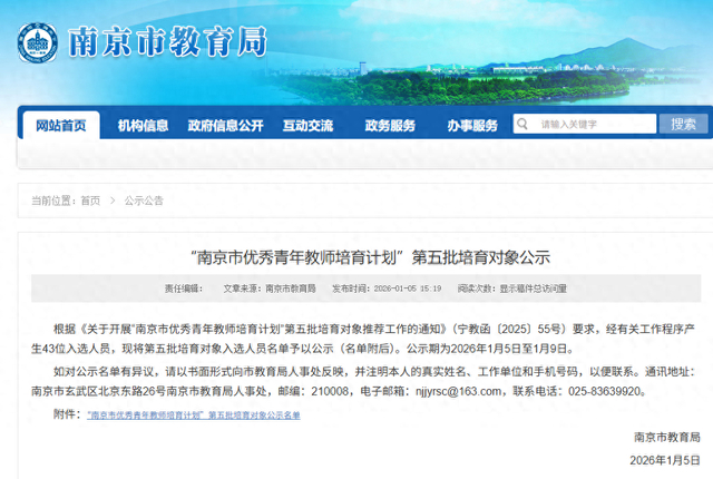 根据《关于开展“南京市优秀青年教师培育计划”第五批培育对象推荐工作的通知》(宁教函〔2025〕55号)要求,经有关工作程序产生43位入选人员,现将第五批培育对象入选人员名单予以公示(名单附后)。公示期为2026年1月5日至1月9日。如对公示名单有异议,请以书面形式向市教育局人事处反映,并注明本人的真实姓名、工作单位和手机号码,以便联系。通讯地址:南京市玄武区北京东路26号南京市教育局人事处,邮编:210008,电子邮箱:njjyrsc@163.com,联系电话:025-83639920。