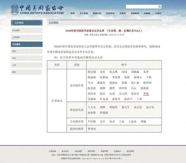 扬子晚报网1月6日讯 (记者 王国柱)1月6日,中国美术家协会公布2024年度新会员名单,泰州籍书画家李俊榜上有名。此前,他已经是中国书法家协会会员,成为全国仅占1.5%-3%比例的国字号“双会员”之一,系泰州第二位“双会员”,这是对他在书画界扎实的艺术功底和亮眼的创作成绩的充分肯定。