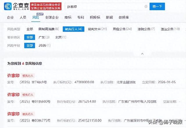 近日,企查查更新显示,许家印新增一则被执行人信息,执行标的4700万元人民币,执行法院为北京金融法院。目前,许家印被执行总金额超30亿,关联多起限制消费案件。