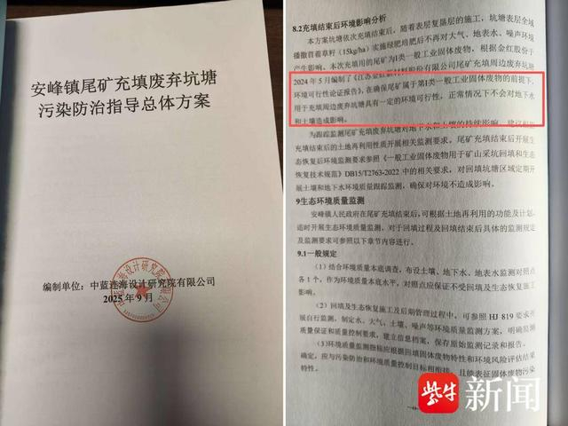 1月5日,记者联系上了安峰镇的孙副镇长,他告诉记者,这里是一个坑塘回填的项目,这些淤泥都是回填材料。回填是严格按照《安峰镇尾矿充填废弃坑塘污染防治指导总体方案》(下称《方案》)执行的。对于村民们担心的环境影响,《方案》中写道,本次充填用的尾矿为I类一般工业固体废物,用于充填周边废弃坑塘具有一定的环境可行性,正常情况下不会对地下水和土壤造成影响。“我们有完整的一套方案,有检测的报告,包括坑塘的本体的检测、回填物的检测,包括后续有持续的监测。”孙副镇长说。