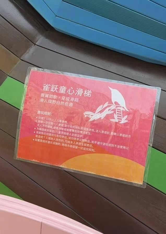 家长提及的这款滑梯,整体造型为鸟儿栖于枝头的模样,滑道为金属材质,目测高约1.5米、宽约0.5米;滑梯侧面张贴的游玩规则写明,该设施仅限5-14岁儿童使用,一次仅限一人,且儿童须由成人全程监护。现场工作人员介绍,这些设施专为儿童游玩设计,成人如需陪同也可使用。同时他提醒,因衣物材质不同,在滑梯上的下滑速度会存在差异,家长务必全程看护好孩子。