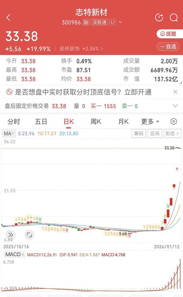 志特新材股票自2026年1月5日至2026年1月12日连续6个交易日涨停,股票价格涨幅为198.57%。