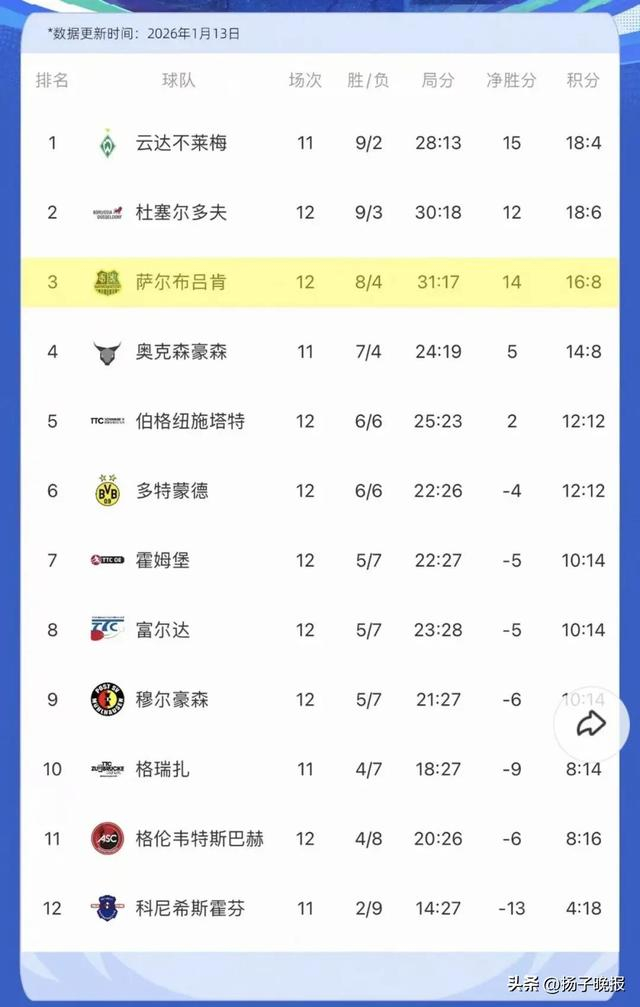 北京时间1月13日凌晨,2025-2026赛季德国乒乓球联赛第12轮上演五盘鏖战,萨尔布吕肯客场挑战多特蒙德,最终以2-3憾负对手。其中,樊振东表现高光,两场单打均以3-0取得胜利,独得两分。