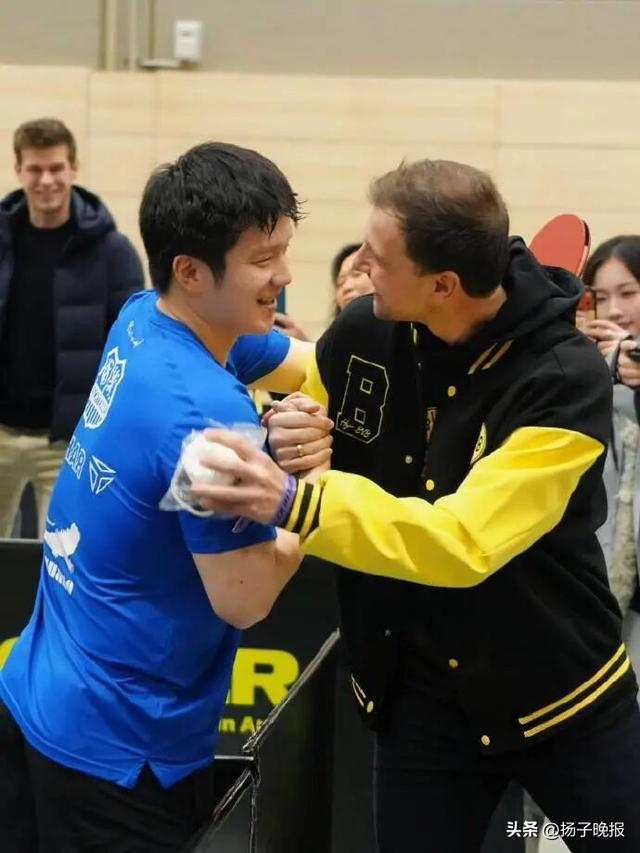 德国名将波尔作为多特蒙德品牌大使,在现场观看比赛,并在赛后与樊振东拥抱致意。