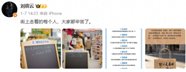 2026年1月7日,作家刘震云来了,他发微博说:“便利店不仅是大家买东西的地方,也每天在见证普通人的很多快乐、思念、疲倦和悲伤。我看了张兴朝和李嘉诚写的冰杯句子,很有意思。很多人说他们带起了一种叫‘便利店文学’的表达形式。”于是,刘震云牵头在自己老家河南的部分便利店门店,开辟出了一块“便利店文学角”,他抛砖引玉地写下了第一句话:“街上走着的每个人,大家都辛苦了。”