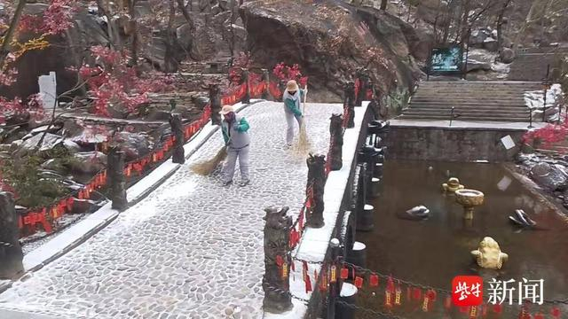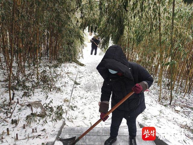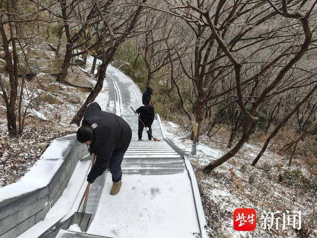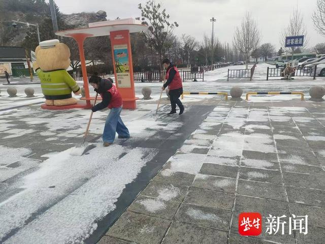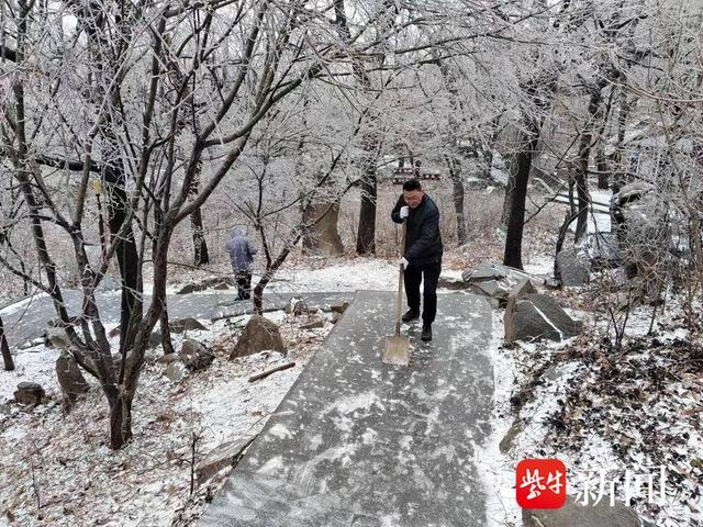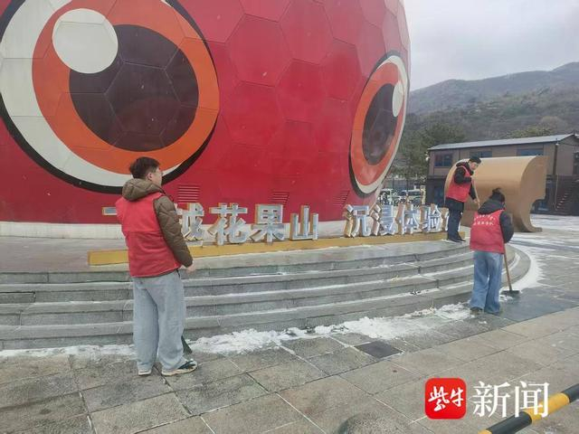 在花果山景区,花间岭·悟云空民宿的工作人员徒步登山、冒雪作业,撒融雪剂、清结冰地面,用脚步丈量责任,用执着坚守诠释着“服务至上”的理念。