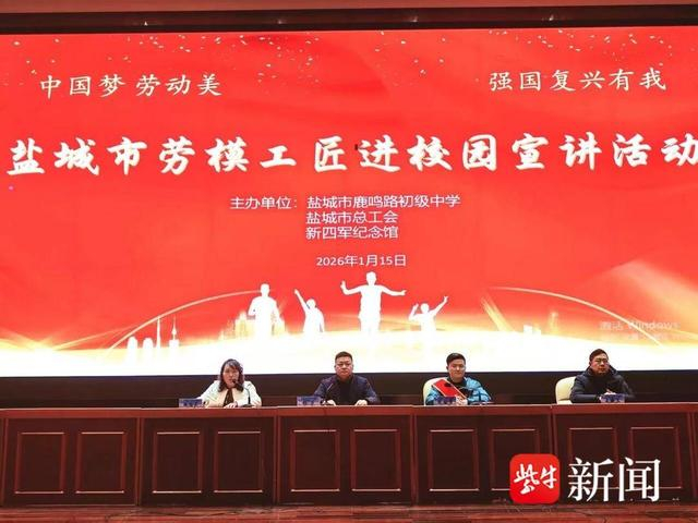 为大力弘扬劳模精神、劳动精神、工匠精神,引导青少年厚植“劳动光荣、创造伟大”的价值理念,1月15日下午,盐城市鹿鸣路初级中学在中校区鹿鸣大讲堂成功举行“对话劳模”成长课堂活动。本次活动特邀盐城市人大代表、劳动模范陈国勇同志走进校园,与初一年级全体师生共赴一场关于奋斗、成长与价值的深度对话。学校党委副书记、校长彭庆出席活动并致辞,工会主席滕锦昊主持本次活动。