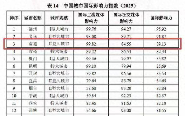 近日,《中国城市国际网络形象指数报告(2025)》(以下简称《报告》)在重庆正式发布。该报告从国际传播力、国际影响力与国际认同力三大维度对全国106座大城市的国际网络形象进行了全面分析。南通市在城市国际网络形象指数总榜中居于第11位,其国际影响力名列全国第三。