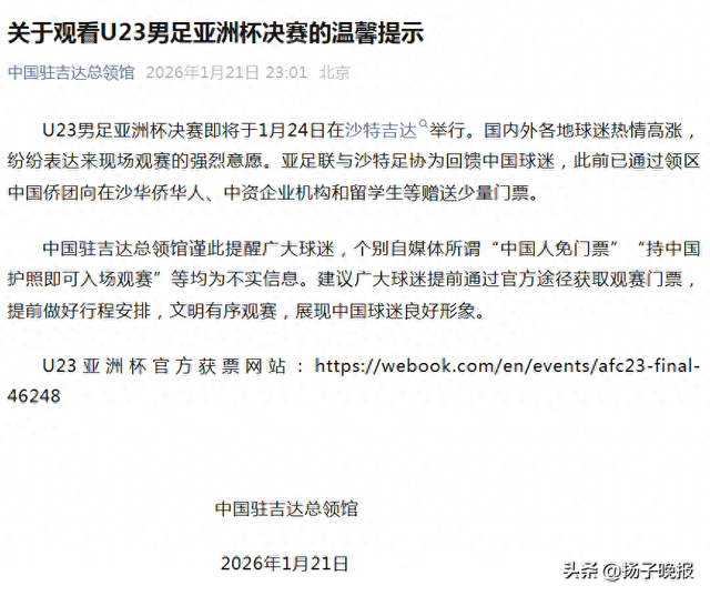 1月21日,记者从中国驻吉达总领事馆获悉,针对一些自媒体博主在短视频平台发布的所谓“中国驻吉达总领事馆和沙特足协为中国球迷提供免费门票、持中国护照即可入场观赛”等内容,总领馆表示,上述内容均为不实信息。