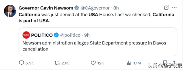 纽森在社交媒体发帖说:“加州刚刚被‘美国之家’拒之门外。我们最后一次查看时,加州还是美国的一部分。”