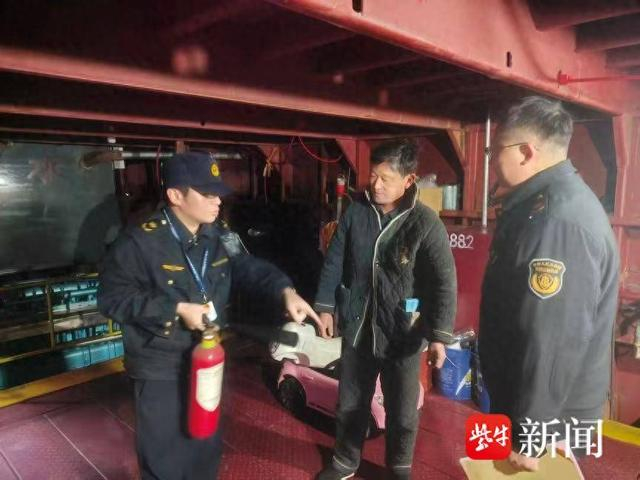 在船舶的生活区,执法人员仔细查看了灭火器的压力是否正常、检验标志是否有效、摆放位置是否合理且易于取用,测试了消防栓的出水情况及水带、水枪的完好性,检查了火灾报警系统是否灵敏可靠,以及通风管道、机舱天窗等防火设施是否处于正常关闭或可用状态。“取暖设备要远离易燃物,做到人离电断,尤其是使用老式电暖炉的,要格外注意”,执法人员再次提醒道。随后,执法人员检查了机舱,要求加强发电机的日常维护,确保冷却系统防冻液充足,并做好在低温环境下突发故障的应急预案。