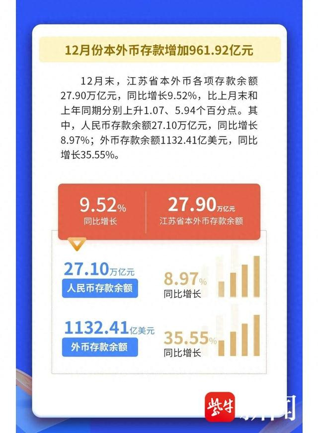 扬子晚报网 1 月 22 日讯(记者 徐兢)快过年了,忙碌了一年的你存了多少钱?1 月 22 日,记者从人民银行江苏省分行获悉,截至 2025 年 12 月末,江苏省本外币各项存款余额27.9万亿元,同比增长9.52%。其中,人民币存款余额 27.1 万亿元,同比增长 8.97%;外币存款余额 1132.41 亿美元,同比增长 35.55%。2025 年 12 月份,本外币存款增加 961.92 亿元。