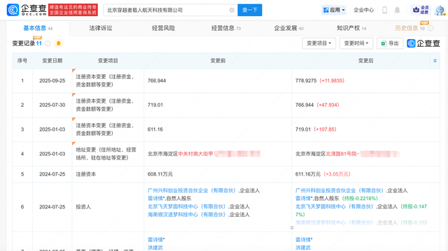 据企查查信息显示,“穿越者壹号(CYZ1)”关联北京穿越者载人航天科技有限公司成立于2023年1月,法定代表人为雷诗情,注册资本778.9万人民币,由雷诗情、谢萌、海南银汉逐梦科技中心(有限合伙)等共同持股。变更记录显示,2025年该公司曾多次增资。