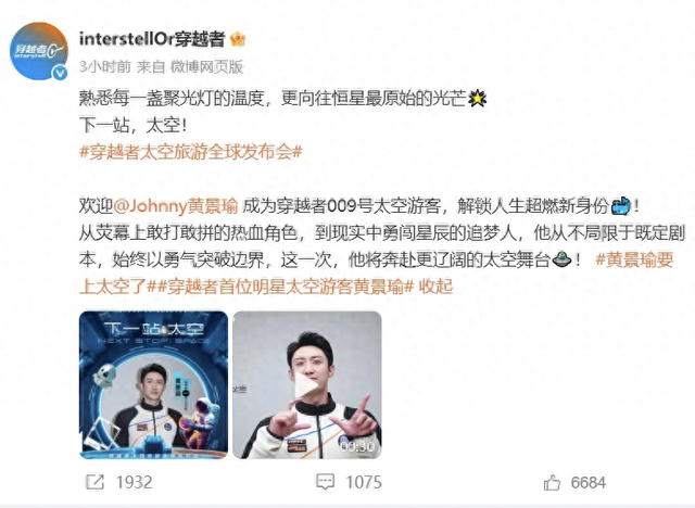 1月22日,@interstellOr穿越者 官宣@Johnny黄景瑜 成为009号太空游客,黄景瑜在vcr中表示很荣幸成为一名太空旅客,将乘坐中国人自己的飞船亲身抵达那片星海。