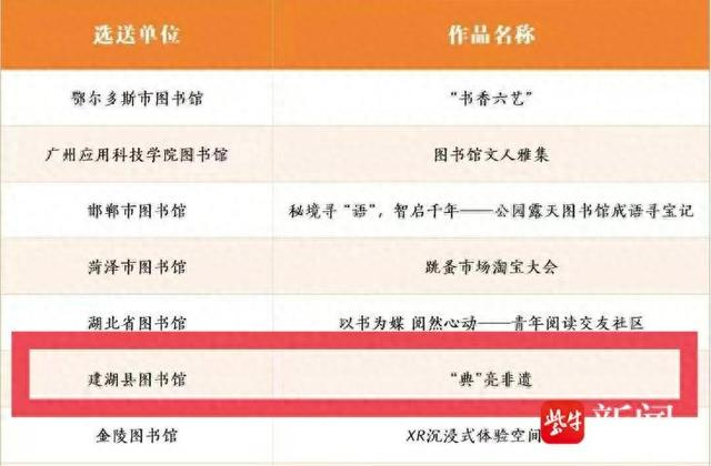 2026年1月19日,在2026年度“图书馆人奇妙夜”盛典公布的“炫彩项目”入选名单中,江苏省盐城市建湖县图书馆申报的“典”亮非遗阅读推广项目成功入选“创新服务类”优秀项目,成为盐城市唯一获此殊荣的单位。该项目凭借独特的“典籍+非遗+文创”融合创新模式,从全国224个申报案例中脱颖而出,跻身最终84个入选项目之列,生动展现了县级公共图书馆在文化传承与服务创新方面的积极探索与扎实成效。