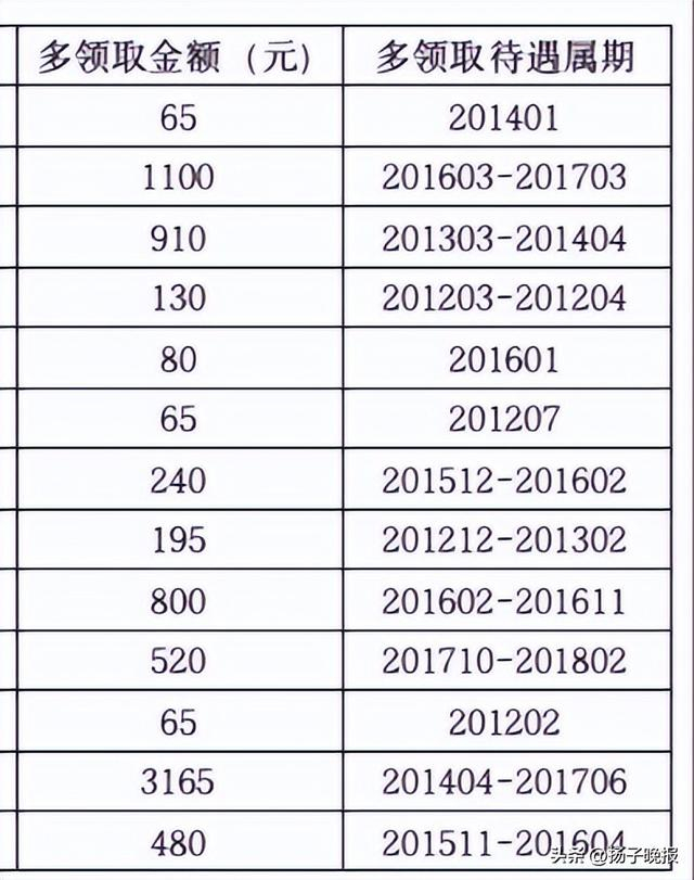相关公告列出了被公告人员信息、待遇退回明细,涉及的多领取金额在数十元到数千元之间。其中多领金额最高的为5974.74元,多领待遇属期为“201608-202008”。此外,公告中不少人仅多领取了一个月的城乡居民养老保险待遇,最低金额为65元。