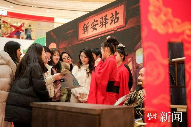 1月23日下午,无锡新吴万达广场中庭区,闲逛的市民身边突然出现一群身穿古装戏服的演员,他们正在进行一场名为《新安驿站:时空之旅》的沉浸式“穿越”剧,并不时与市民互动。剧中出现泰伯、邹忠倚等无锡历史人物线索,唤醒城市记忆。