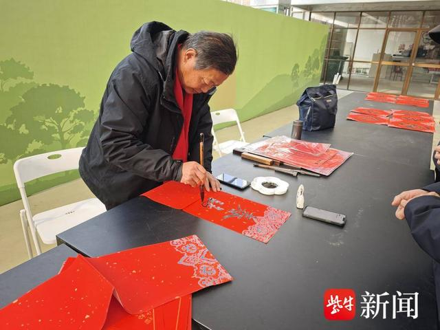 在“傅家边梅好市集”,年味与烟火气交织蔓延。傅家边草莓鲜果色泽艳丽、果香浓郁,青梅脆梅、梅酒等深加工产品带着清甜回甘,塘西蟹稻香大米、红美人柑橘等本地农产品摆满摊位,非遗特产洪蓝牛肉、玉带糕更是供不应求。市集一角,书法家挥毫泼墨,笔走龙蛇间,一幅幅饱含祝福的春联与福字新鲜出炉,免费赠予游客。