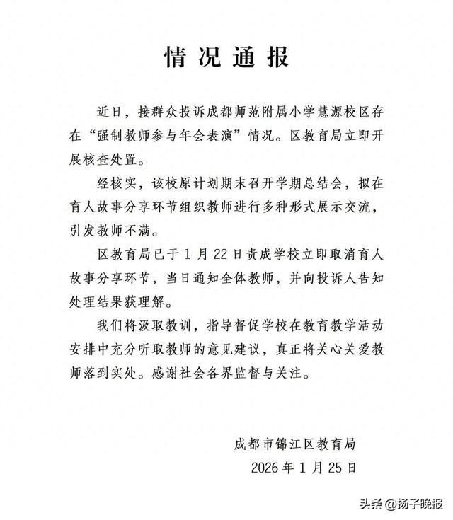 近日,接群众投诉成都师范附属小学慧源校区存在“强制教师参与年会表演”情况。区教育局立即开展核查处置。