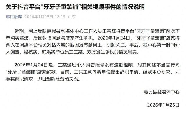 事后,我中心第一时间介入调查,经核实,确系我单位员工王某,双方发生争执的情况属实。2026年1月24日晚,王某通过个人抖音账号发布道歉视频,对其网络不当言行向“牙牙子童装铺”店家致歉。目前,王某主动向我单位提出辞职申请。经我中心研究,同意其离职请求,即日起解除劳动关系。