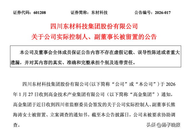 图片来源:高金富恒集团微信东材科技称,公司于2026年1月27日收到高金技术产业集团有限公司(下称“高金集团”)通知,高金集团于近日收到四川省监察委员会签发的关于公司实际控制人、副董事长熊海涛被留置、立案调查的通知书。截至公告披露日,公司未被要求协助调查。