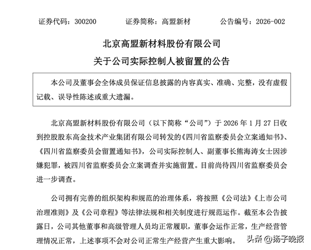 高盟新材公告,公司于2026年1月27日收到控股股东高金技术产业集团有限公司转发的《四川省监察委员会立案通知书》《四川省监察委员会留置通知书》,公司实际控制人、副董事长熊海涛因涉嫌犯罪,被四川省监察委员会立案调查并实施留置。目前尚待四川省监察委员会进一步调查。