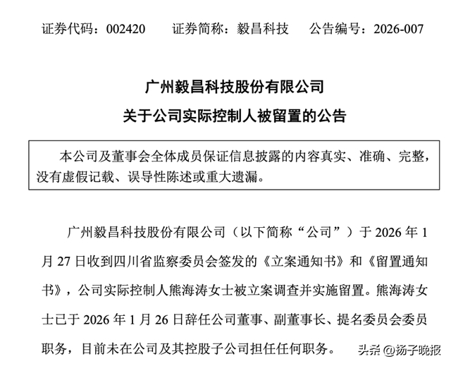 同日(1月27日),毅昌科技公告,公司于2026年1月27日收到四川省监察委员会签发的《立案通知书》和《留置通知书》,公司实际控制人熊海涛被立案调查并实施留置。熊海涛已于2026年1月26日辞任公司董事、副董事长、提名委员会委员职务,目前未在公司及其控股子公司担任任何职务。