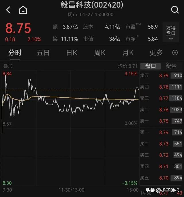截至1月27日收盘,毅昌科技涨2.1%,报8.75元/股,总市值为36亿元。