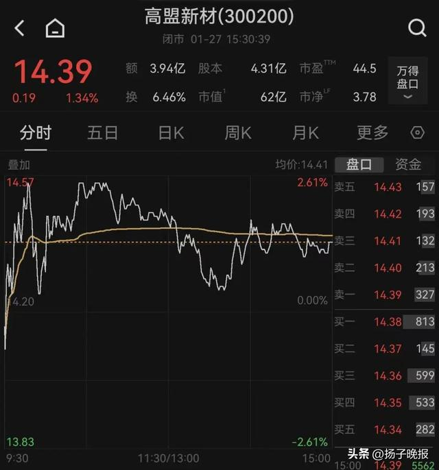 1月7日,高盟新材曾涨停。截至27日收盘,高盟新材涨1.34%,报14.39元/股,总市值为62亿元。