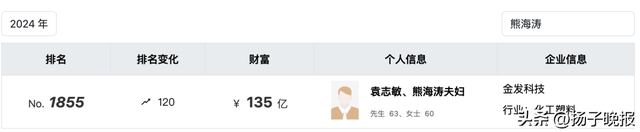 2024年3月25日,胡润研究院发布《2024胡润全球富豪榜》,袁志敏、熊海涛以135亿财富位列榜单第1855位。