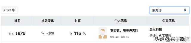 2023年3月23日,胡润研究院发布《2023胡润全球富豪榜》,袁志敏、熊海涛以115亿财富位列榜单第1975位。