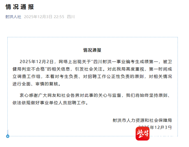 2025年12月2日,网络上出现关于“四川射洪一事业编考生成绩第一,被卫健局判定不合格”的相关信息,引发社会关注。对此高度重视,第一时间成立调查工作组,本着对考生负责、对招聘工作公正性负责的原则,对相关情况进行全面、审慎的复核。