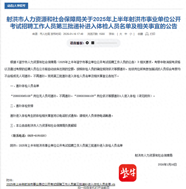 扬子晚报/紫牛新闻记者在射洪市人民政府官网查看到,2026年1月16日发布的《关于2025年上半年射洪市事业单位公开考试招聘工作人员第三批递补进入体检人员名单及相关事宜的公告》中显示,根据相关要求,考察中取消报考资格以及通过考察的应聘人员在公示前自动放弃出现的空额,按照体检人员的确定规则依次等额递补,如该岗位所有参加面试的人员综合考察均不合格或无人可递补,不再递补。其中提到,“208003065108”岗位无人员可递补,不再递补;“208003066109”岗位依次等额递补1人进入体检。该公告落款单位是射洪市人力资源和社会保障局,并附上《2025年上半年射洪市事业单位公开考试招聘工作人员第三批递补进入体检人员名单》。