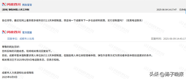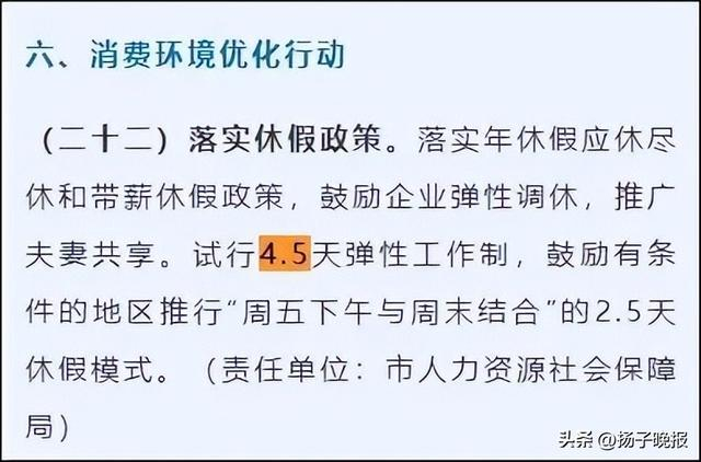 去年,四川省绵阳市商务局曾印发《绵阳市提振消费专项行动2025年工作清单》。其中,备受关注的落实休假政策中提到,落实年休假应休尽休和带薪休假政策,鼓励企业弹性调休,推广夫妻共享。试行4.5天弹性工作制,鼓励有条件的地区推行“周五下午与周末结合”的2.5天休假模式。