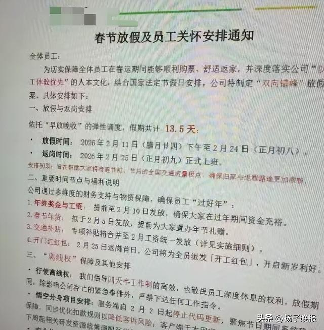 近日,有网友发布福建一科技有限公司的一则春节提前放假通知,称公司春节放假13.5天,每周工作4天半,员工享有“离线权”。