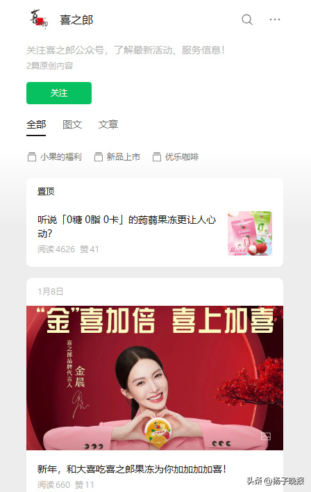 此前于1月7日,该账号曾置顶发布金晨代言宣传,并配文“喜之郎喜上加喜组合”并艾特金晨微博。