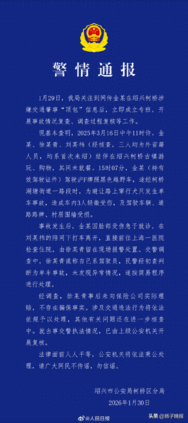 1月29日,我局关注到网传金某在绍兴柯桥涉嫌交通肇事“顶包”信息后,立即成立专班,开展事故情况复查、调查过程复核等工作。