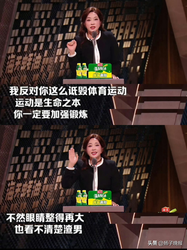 刘晓庆当场驳斥:“打羽毛球就是比整容管用!我反对诋毁体育运动!”强调运动对健康的长期价值;随后补刀调侃:“一定要加强锻炼,不然眼睛整得再大,也看不清楚渣男”。