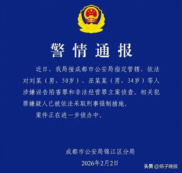 近日,我局接成都市公安局指定管辖,依法对刘某(男,50岁)、巫某某(男,34岁)等人涉嫌诬告陷害罪和非法经营罪立案侦查。相关犯罪嫌疑人已被依法采取刑事强制措施。