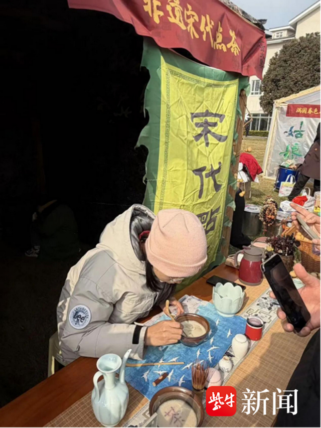传统点茶技艺 王乔波 摄一位专程从南京赶来的游客说:“这里氛围特别好,东西实在、人情味浓。我买了雨山茶和千张,还尝了刚出笼的蟹黄汤包,味道非常地道。没想到年货大集能把吃喝玩乐、文化体验结合得这么自然,让人找回小时候过年的感觉。”