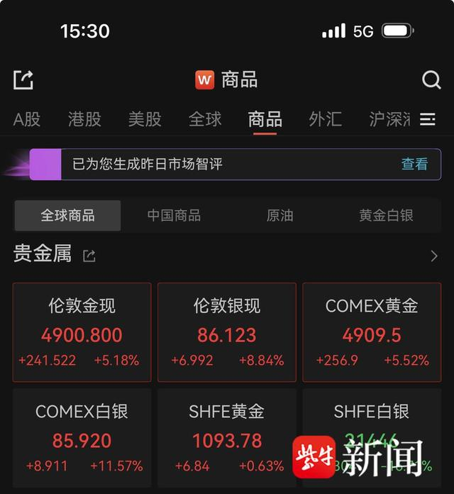 扬子晚报网2月3日讯(记者 范晓林)截至发稿,现货黄金重新站上4900美元/盎司,日内涨超5%;现货白银报86.105美元/盎司,日内涨12%。金饰品价格方面,老凤祥克均价1518元,周生生克均价1498元,周大福、周大生克均价1495元。二级市场贵金属板块龙头股晓程科技日内涨幅18.67%,湖南黄金涨停。