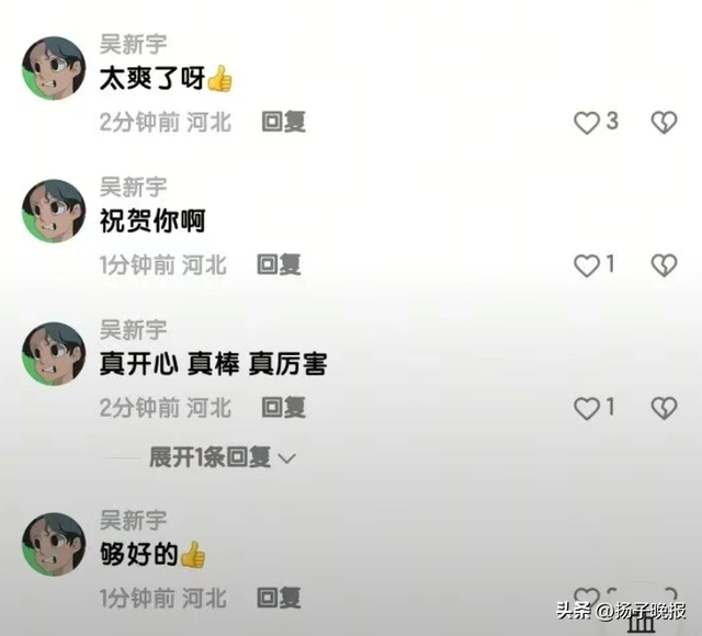 一个叫做“吴新宇”的账号却在评论区公开发表“祝贺你”“真开心”等言论。