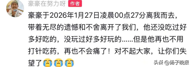 1月27日,10岁的“抗癌小王子”豪豪不幸去世,许多网友为其悲痛不已,其父亲告诉记者“孩子解脱了”↓↓↓