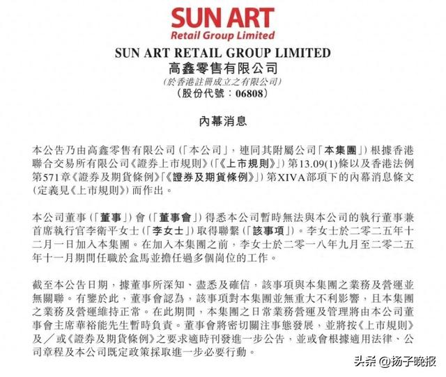 2月4日,大润发母公司高鑫零售在港交所发布公告称,公司暂时无法与执行董事兼首席执行官李卫平取得联系。