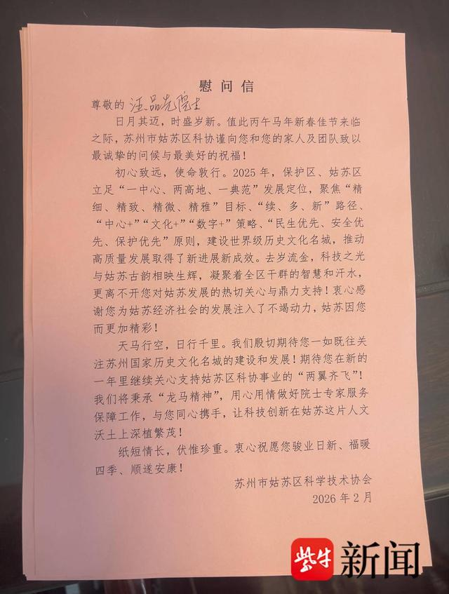 成绩的背后,离不开广大院士专家的长期关注与倾力支持。为此,姑苏区科协联合古吴轩出版社,特别定制了一份“家乡年礼”:一本可随身携带的文旅口袋书《姑苏古城志》,一条承载新春祥瑞的央视春晚红围巾,一封纸短情长的新年贺信。礼物虽轻,却凝聚着深深的敬意与暖心的年味,让院士专家们感受到来自家乡的温情关怀。