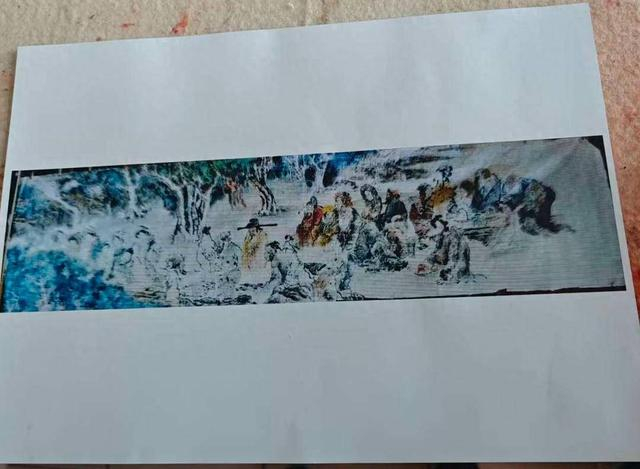 在采访中,谢崇山坦言,这是他68年绘画生涯中最难创作的作品。在扬州市区的谢崇山画室根本无法创作这样的巨幅画,他选用了20年的红星纸,专程去江都曹王大画室创作,由于原稿太大无法打开,他就蹲在地上作画,边画边动脑筋,不断修改,经常碰坏了画,只好再补画;每个人物造型都不一样,他调动几十年的创作积累,做到每个人物采用不同的笔法;以前画家创作此类题材都是采用工笔画,加点小写意,谢崇山创作此幅画时则融合了小写意、大写意、泼墨、泼彩等多种技法,从而取得了成功。